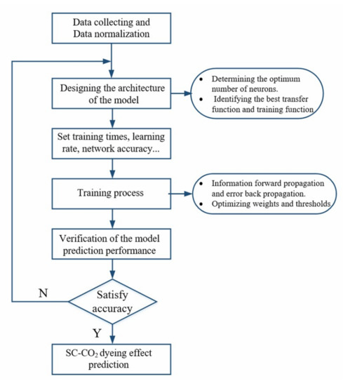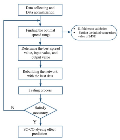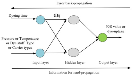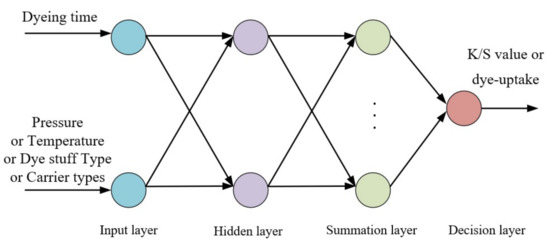 With numerous advantages compared with conventional water dyeing, such as eliminating effluent discharge, saving water resources and preserving energy, the supercritical carbon dioxide (SC-CO2) dyeing process is considered a green and energy-saving process in terms of sustainable development and being environmentally friendly [1,2,3,4,5]. However, in order to promote the application of supercritical fluid dyeing (SFD), it is necessary to establish the prediction model of the dyeing effect in SC-CO2 in different working conditions such as dyeing time, temperature, pressure, dyestuff type and carrier type. Though the mathematical model derived from Fick’s second law [6,7,8,9,10] and the pseudo–second–order kinetic model [11] have been established to predict the dyeing effect in SC-CO2, the lack of the parameters such as diffusion coefficient limits their applications. Artificial neural network (ANN) with superior ability to learn and classify data which come from studies on the function of the brain and nerve systems as well as the mechanism of learning and responding [12,13]. Generalized Regression Neural Network (GRNN) and Back Propagation Neural Network (BPNN) are two commonly paradigms [14,15]. BPNN is the most popular method for its complex self-learning and adaptive capabilities to process non-linear and complex system problems preferably [16,17]. GRNN is an emerging model with a simple network structure and network training which significantly reduced training time and computational complexity while ensuring high prediction accuracy [18,19,20]. It has been proved that ANN has been widely applied in many fields of the chemical industry, such as supercritical extraction [21,22,23,24], solubility research [25,26], phase equilibrium [27] and heat transfer [28]. To the best of knowledge, there is to date no openly available systematic literature predicted the K/S value and dye-uptake of SC-CO2 dyeing using ANN. It is necessary to propose a prediction model of SC- CO2 dyeing effect, providing the foundation for SC-CO2 dyeing to realize industrialization.