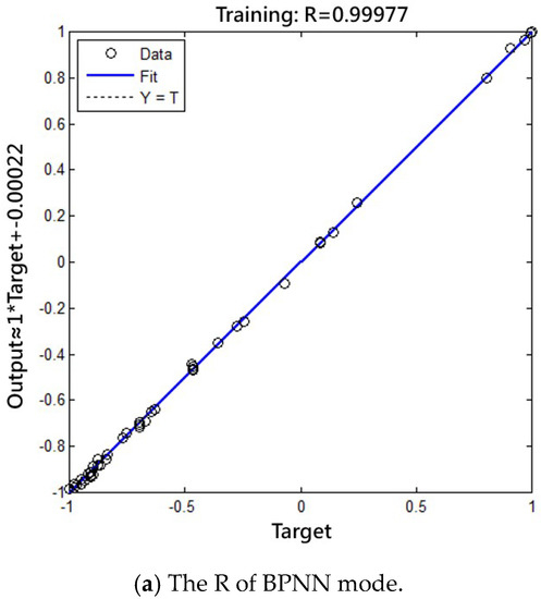 Sigmoid function is the most commonly used for non-linear relationships and represents an activation function for the respective neural layer. It has the advantages of being smooth, continuous and differentiable. In addition, it can be utilized with the gradient descent method and is more accurate than the linear function. In the current study, two different activation functions were employed during the training process, consisting of a nonlinear tangent-sigmoid transfer (tansig) function at the hidden layer and linear transfer (purelin) functions for neuron activation at the input and output layers [39]. The learning in the neural network takes place by modifying the weights of the neurons according to the error between the values of the actual output and target output. As illustrated by Table 4, the MSE and MRE of Levenberg-Marquardt (LM) is less than that of Traingdx function and its R is better than that of Traingdx function. Therefore, LM was selected as the training function, which is the combination of the Gaussian-Newton method and gradient descent method was used for its fault tolerance and fast convergence ability. In order to avoid over fitting and falling into local minimum, we finally determined the best BPNN structure was: training times as 2000, training precision as 10−6, learning ratio as 0.1 and the minimum descent gradient of the performance function MSE was 10−10.