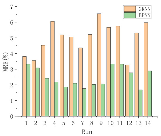 MRE of GRNN model and BPNN model based on 10 runs of experimental data.