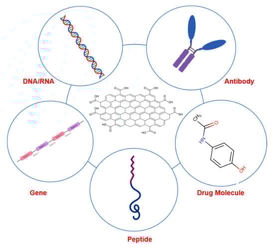 In the past few decades, various nanomaterials with different characteristics in terms of size, shape, and composition have been studied in drug delivery attempts, such as various metals and semimetals, carbon nanotubes, liposomes, and micelles. Graphene and its derivatives possess advantageous properties and thus have emerged as a promising solution for systematic, target-specific, and controlled release of biomolecules in vivo. The planar 2D structure of graphene is well suited for binding and immobilizing various substances, such as synthetic drugs, metals, biomolecules, and fluorescent probes (Figure 2). Compared to carbon nanotubes (CNTs), graphene exhibits some crucial qualities, such as economically easy synthesis, a large surface area, and greater biocompatibility, due to the significantly lower amount of toxic metal residues.