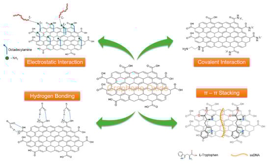 - Georgakilas, V.; Tiwari, J.N.; Kemp, K.C.; Perman, J.; Bourlinos, A.B.; Kim, K.S.; Zbořil, R. Noncovalent Functionalization of Graphene and Graphene Oxide for Energy Materials, Biosensing, Catalytic, and Biomedical Applications. Chem. Rev. 2016, 116, 5464–5519. [Google Scholar] [CrossRef] [PubMed]