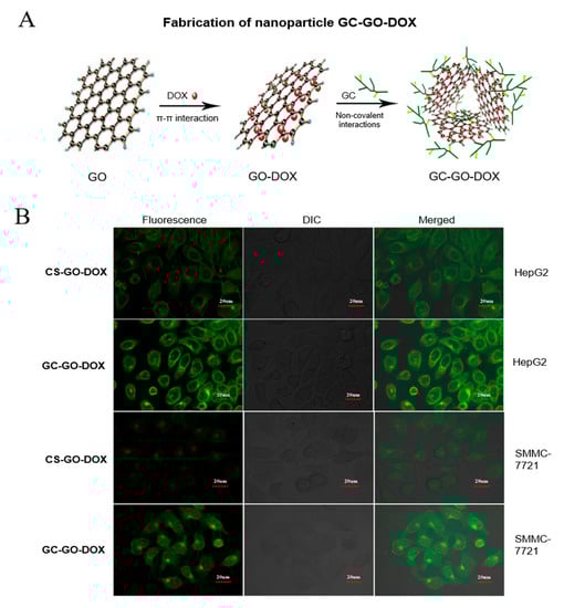 (A) Schematic illustration of the synthesis of galactosylated chitosan-modified GO-Doxorubicin (GC-GO-DOX) (B) localization and intracellular imaging of fluorescein isothiocyanate (FITC)-labeled GC-GO-DOX (green) and chitosan-modified GO-Doxorubicin (green) in HepG2 and SMMC-7221 cells 2 h post-transfection, scale bar 20 µm. (Reproduced with permission from [83]. Copyright 2018, Elsevier).