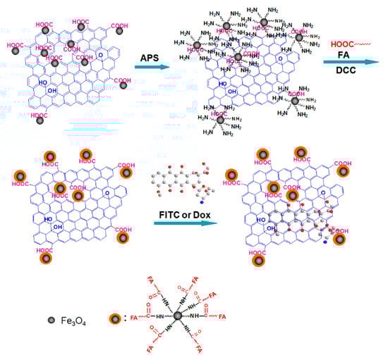 Synthesis of a multi functionalized drug delivery system based on GO and magnetite NPs. (Reproduced with permission from [99]. Copyright 2011, Royal Society of Chemistry).