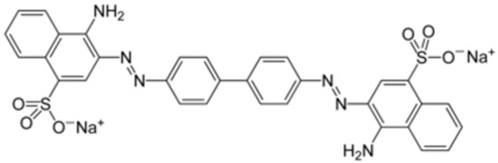 Congo red (CR) has been used as model contaminant in the present study, considering the large amount of azo dyes which are widely applied in the paper and pulp, textiles, leather, cosmetics, and plastic industries. Around 70% of the total consumption of dyes is represented by azo dye compounds [18,19]. Azo dyes contain at least one double bond (-N = N-), but may contain even more groups as mono-azo, di-azo, tri-azo, poly-azo. The azo group is generally attached to a benzene or naphthenic ring or may be attached to heterocyclic aromatic structures or aliphatic groups. In terms of chemical structure, dyes present a high stability at the molecules, which are synthesized to resist light, chemical, and biological decomposition and other means of exposure [20,21]. Additionally, some studies [18] have reported that azo dyes are able to alter the physical and chemical properties of soil, deteriorating water quality and generating harm to flora and fauna.
