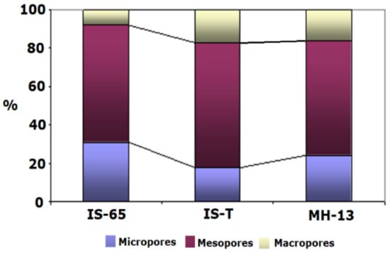 In order to determine the particle pore size distribution, the Barrett–Joyner–Halenda (BJH) method has been applied. The surface corresponding to pores with a diameter between 2 and 50 nm, which corresponds to mesopores, represents 60.9% of the surface for IS-65 soil (862 m2/g), 65.6% for IS-T soil (473 m2/g), and 59.8% of the total soil surface for MH-13 (394 m2/g) (Figure 2). The surface area corresponding to the macropore domain for diameters larger than 50 nm is extremely small compared to the surface area of the micro and mesopores. Thus, for IS-T soil, the surface of macropores is 127 m2/g, representing 17% of the total surface, while for MH-13 it is 107 m2/g, representing 16.31% of the total surface. The IS-65 soil has the smallest surface of macropores at 111.5 m2/g, which represents 7.87% of the total surface.