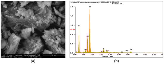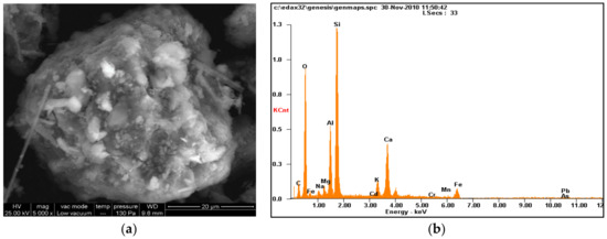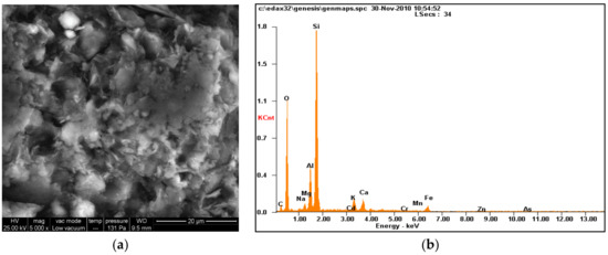 The SEM micrographs and corresponding EDS spectrum were performed for all samples, and one typical microphotograph at 20 μm and spectrum of soil are given in Figure 3b, Figure 4b and Figure 5b. The SEM images are presented in Figure 3a, Figure 4a and Figure 5a, which illustrate the solid flakes of the soil particles. The morphology of the samples shows a relatively dense, homogeneous internal structure in the form of conglomerate particles, characterized by layered hexagonal and pseudohexagonal crystalline structures, a texture typical of clay minerals. Generally, the edges of the crystallites are oblique, but smaller units with irregular edges can also be observed.