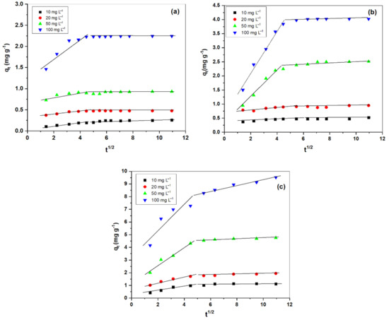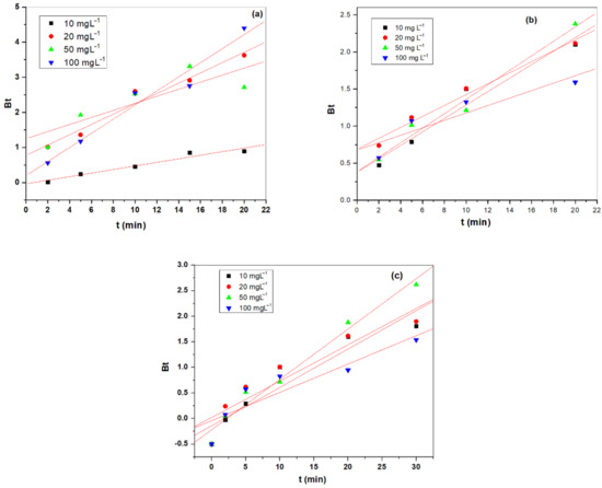 The graph of Bt versus time, which is depicted in Figure 8a–c, confirms that for soils IS-65 and IS-T, film diffusion or external mass transfer is the major dominating factor in the first stage of the process because the lines do not intersect the origin and data are nonlinear [37,46,51,52]. While for soil MH-13 (50 mg L−1, 100 mg L−1 CR), the values of intercept (−0.24) confirm that external mass transfer is the controlling step in the first stage of the process. When the amount of organic molecules that reach the surface of soil particles increases above a certain limit, the sorption process begins to be controlled by intraparticle diffusion mechanisms. Such results have been reported in the sorption of organic pollutants such as Quinoline Yellow on agricultural waste and ash [53].