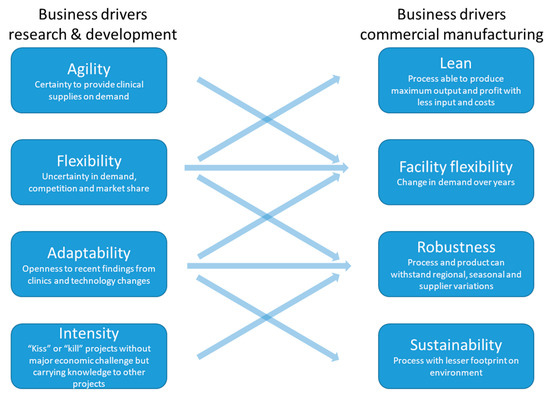 There have been significant knowledge-driven advancements in continuous bioprocessing technologies. Perfusion processing is now significantly less complex, less prone to contamination, and more readily scalable than previously. Similarly, multiple solutions for continuous downstream processing have intensified the process to accommodate the increased titers and processing rate. A cost-of-goods analysis on consumables has shown a 6–10-fold cost reduction from the conventional batch to the intensified continuous process [8]. Thus, the negative assessments from within the industry of continuous perfusion and downstream processing may, overall, reflect a lack of direct exposure or experience with continuous technology combined with a relative lack of case studies documenting success [11]. Case studies and reports of superior performance, when compared to existing batch platforms, will further help the rapid adoption of continuous bioprocessing. Moreover, such case studies can reflect business drivers’ alignment during research and development of a biologics drug and its commercial manufacturing to create a supportive environment (Figure 4). The business drivers during research and development are focused on maximizing knowledge acquisition with minimal expenditure. As “kiss” or “kill” is an approach regarding either continuation or termination heavily used in early stage of drug development, a knowledge spill-over across projects is a supporting driver. In fact, nine times out of 10, candidate molecules that show promise at the early stage of development fail at later trials. Therefore, while accuracy in such a decision is critical for ultimate success, a delay in search of accuracy comes with a heavy cost due to the fact that there are many candidate molecules at the early stage. At the later stages, the speed and flexibility in process technology for achieving capacity for clinical supplies and later-stage market demand drive the development strategy. On the commercial side, business drivers focus on maximizing supplies and savings while maintaining the promised quality. This involves improving the process’ robustness by continued process validation programs, continuous improvement projects for lean manufacturing, and efficient product facility change-overs.