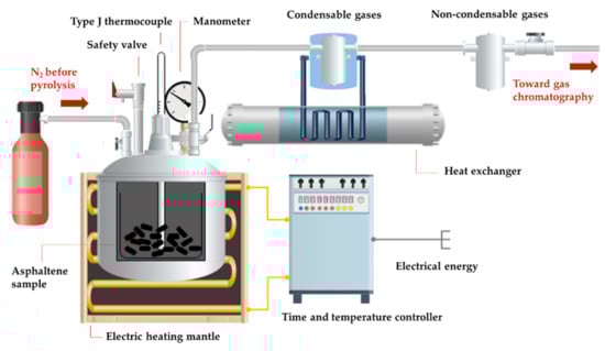 Considering the TGA/DTA results, the pyrolysis was carried out between 330–450 °C using a reactor batch. More precisely, pyrolysis reactions were carried out in a 270 mL stainless steel batch type reactor (Figure 1). Briefly, a Pyrex glass containing 7 g of asphaltene was loaded into the reactor. Then, the reactor was purged several times with high-pressure N2 to provide an inert environment. The reaction proceeded under non-isothermal conditions from 25 °C to the pyrolysis temperature (330, 360, 390, 420, and 450 °C) at a heating rate of 5 °C/min. The reaction stopped immediately after reaching the pyrolysis temperature by removing the reactor from the external electric heater and plunging it in a cold-water bath to quench the reaction. The reactor content was collected as unreacted asphaltenes, coke, liquid, and non-condensable gaseous products. The yield of the solid and liquid fractions was determined gravimetrically. The material balance was made to calculate the quantity of non-condensable gases. Gaseous and liquid products were taken in sealed probes directly connected to the reactor, and they were tested immediately after the pyrolysis. After pyrolysis, the solid fraction inside the reactor was extracted with toluene recirculation in a Soxhlet apparatus for 12 h. The soluble fraction was recovered as asphaltenes and the insoluble fraction as coke. All the liquid and solid samples were conserved in amber glass flasks at low temperatures in a desiccator.