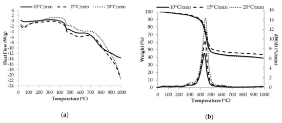 TGA/DTA plots were similar in shape at different heating rates (10, 15, and 20 °C/min), but differed slightly in their location (Figure 3b). This can be explained because the increase in the heating rate causes that the time to reach the pyrolysis temperature to become shorter. It also benefits the reaction development, while the temperature gradient between the interior of the sample and its surface increases. Thus, the superficial light products are carried outside by the gas flow, and those products inside the solid evaporate at a higher temperature, which causes that the temperature of the maximum weight loss rate moves to a hotter zone.