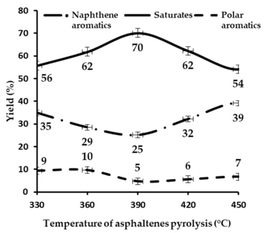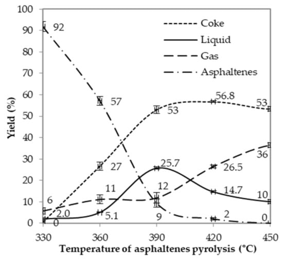 The behavior presented by the asphaltenes during pyrolysis was congruent with the previously explained potential mechanism of reaction. Thus, the material balance showed that the content of asphaltenes decreased until zero at 450 °C (Figure 7). At this temperature, the asphaltenes were completely decomposed to produce mainly coke and gases (methane, ethane, propane, and pentane). This was consistent with the results found by Douda et al. [] for Maya crude asphaltenes, and by Yasar et al. [] for light and heavy Arabian crudes.