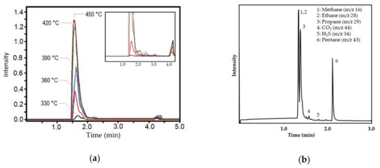 (a) The GC analysis of the gaseous product at different temperatures of the asphaltenes pyrolysis and; (b) identified compounds by GC-MS in the gaseous product at 390 °C.