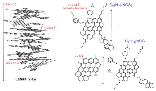 The diagram of the structure of the original asphaltenes (Figure 6) remarks that the interchain distance was constant (3.5 Å) during thermal conversion and was within the average range (3.4–3.7 Å) reported by Al Humaidan et al. []. In addition to the interlayer distance (dγ) between the aromatic sheets, this parameter was related to planarity and showed the absence of distortions of the aromatic ring structures, which could have been caused by the inclusion of atoms, saturation, or naphthenic and aliphatic structures. The distance dγ presented a similar behavior than dm since the aromatic sheets remained at an equal distance with the aliphatic chains attached to them. The dγ (5.9–6.4 Å) were congruent with those reported (4.4–6.2 Å) by AlHumaidan et al. [] and Liao et al. []. In the same way, the value for the average diameter of the aromatic sheets of the asphaltenes (14 Å) was in the range of typical values (10.4–18.1 Å). This was close to the values obtained by the direct molecular imaging method corresponding to an asphaltene molecule with approximately seven fused aromatic rings []. Thus, each asphaltene molecule initially contained a long axis of seven fused rings (size ~14 Å). Then, the value in the aromatic sheet decreased (9 Å) at 390 °C, which was equivalent to approximately six fused rings.