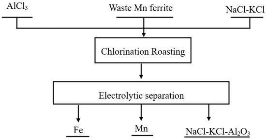 Ferrites are widely used in the electronics industry [1,2]. Since 2008, more than 250,000 tons of Mn-Zn ferrite have been produced annually in China [3]. A large amount of waste ferrite is generated in the manufacturing process of ferrite [3]. Traditional processes for treating waste ferrite included the following procedures: H2SO4 leaching, reducing, purification, co-precipitation, ball milling, sintering, etc. [4]. The reducing agent used in traditional processes is generally high-purity reduced iron powder [5]. The high price of high-purity iron powder severely affects the application of traditional processes [5]. The development of new processes is very necessary. Chlorination has received increasing attention in the treatment of solid waste and slag [6,7,8,9,10]. The crystal structure of Mn ferrite (MnFe2O4) is spinel [11]. In our previous work, we reported that molten salt chlorination destroyed the spinel structure of (Mn,Fe)(Cr,V)2O4 with AlCl3, and then MnCl2, CrCl3, FeCl2 and VCl3 were obtained [12,13]. In order to recover the Fe and Mn in waste ferrite, we propose that the new process includes the following two steps: chlorination of waste Mn ferrite with AlCl3 and the separation of Fe and Mn by molten salt electrolysis. Figure 1 shows a flow diagram of a novel method for the utilization of waste Mn ferrite.