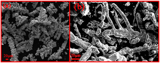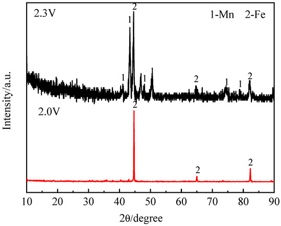 According to the calculated decomposition voltage, metal Fe was obtained when the electrolysis voltage exceeded 1.1 V. Meanwhile, metal Mn was obtained at voltages exceeding 2.3 V. The XRD in Figure 3 shows that the deposited products at 2.3 V are metal Fe and Mn. Meanwhile, the deposited product at 2.0 V is metal Fe. The electrolysis voltage is increased from 2.0 V to 2.3 V, and Mn2+ ions were electrolyzed to metal Mn. The SEM morphology of the deposited products is shown in Figure 4. The morphology of the product obtained at 2.0 V is dendritic. The morphology of metal Fe and Mn at 2.3 V exhibits a stick-like shape. The element contents of Fe and Mn in electrodeposited product were determined using ICP-OES. The Fe/Mn mass ratios of deposited product at 2 V and 2.3 V are 687 and 3.2, respectively. Thus, the different proportions of metal Fe-Mn were prepared by controlling the electrolytic voltages.