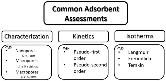 In the literature, the materials used for PW are commonly assessed by characterization, kinetics and isotherms [26]. On a molecular level, adsorption is a process where attractive forces associate a solute (adsorbate) to a solid surface (adsorbent). The solid material used for the adsorption consists of a porous medium with a high internal surface area [27]. It is a common practice in the literature to describe these solid media by the parameters shown in Figure 1.