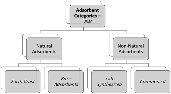 Different types of adsorbent materials have been used for the treatment of PW. These materials are often considered as natural (natural adsorbents) or synthetic (non-natural adsorbents) adsorbents [64]. The most common adsorbents that have been used for the treatment of contaminated water, especially produced water, are described in the following sections. Adsorbents derived from the Earth’s crust and biological sources were categorized under the natural adsorbent sections. On the other hand, non-natural adsorbents included adsorbents synthesized in the lab or obtained by buying them from commercial entities. Figure 2 shows an overview of the different categories of adsorbents defined in this paper. It is important to note that biological adsorbents in this paper are those found from agricultural practices (trees and their derivatives) and the food chain waste. Table 5 and Table 6 show a summary of the results reported for each discussed study in the sections below.