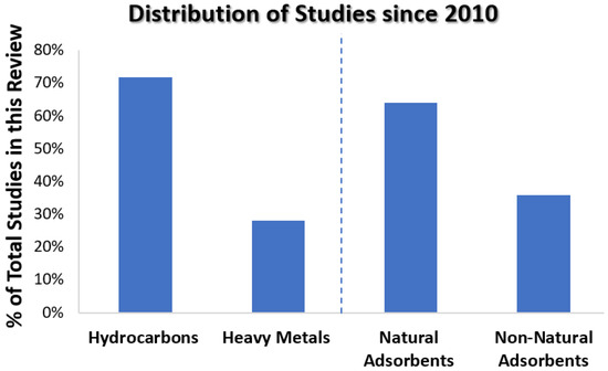 Distribution of recent adsorption studies, since 2010. The left hand side shows the portion of adsorbent studies that targeted hydrocarbons or heavy metals, where the right hand side is the portion of studies that utilized natural or non-natural adsorbents.