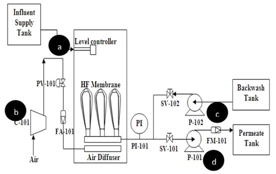 The schematic layout of th submerged Membrane Bioreactor (MBR) pilot plant: a—inlet stream, b—aeration stream, c—backwash stream, d—permeate stream.
