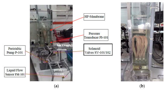 (a) Submerged MBR bench scale plant; (b) Hollow Fibre (HF)-Membrane (with three membrane modules).