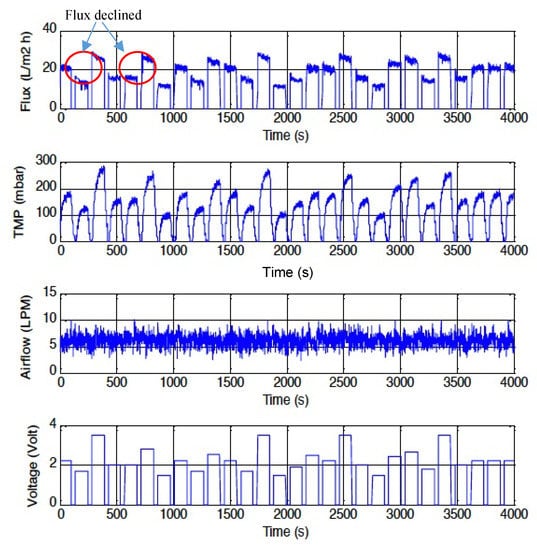Input and output data for the SMBR filtration process: The input is the permeate pump voltage while the outputs are the flux and TMP. The aeration airflow during filtration is set around 6 to 8 L per minute (LPM) to maintain high intensity of bubble flow in cleaning the membrane.