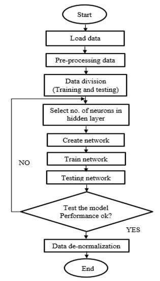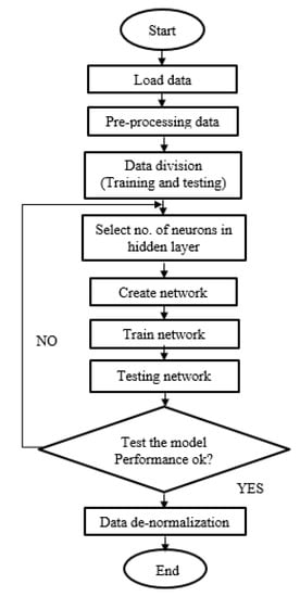 For the feed-forward neural network, the tan-sigmoid transfer function was employed for the hidden layer and linear weights for the output layer. The backpropagation was used for the network training of 1000 epochs as the set stooping criteria. Then, the FFNN model was provided with the testing data once the training stage was stopped. To ensure good prediction of models, the performance criteria using MSE, MAD, and R2 were performed. The procedure of developing the FFNN is described in Figure 5.