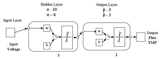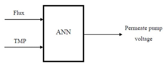 This section presents the Neural Network Internal Model Control (IMC) methodology and its implementation to the Membrane Bioreactor System. For the IMC control architecture, it is crucial to have good estimation of model since the controller is designed based on the inverse of the model. Using the neural network, the training of the inverse model is similar to the training of the forward model. The training may vary based on the variables used as inputs and outputs of the model. The best hidden neuron structures from the network architecture for all ANN modelling methods were used to train the acquired set of 2400 data. The proper structure of the ANN model inverse model was needed. The inverse model of the SMBR filtration process built-up from FFNN, RBFNN and NARXNN which were trained by considering Flux and TMP as input data and voltage as an output data as shown in Figure 9. In this work, the backpropagation for feedforward neural network (FFNN) was used for calculating the gradients. Meanwhile, the Levenberg–Marquardt (LM) was the optimization algorithm used for training the neural network using the gradients computed with backpropagation.