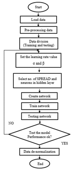 The Gaussian transfer function was employed for the hidden layer and linear weights for the output layer as the ones widely used when modelling with radial basis function neural network. The network was trained using back propagation algorithm for the range of 1000 training epochs. After the training stage stopped, the RBFNN model was provided with the testing data. The prediction ability was measured based on the performance criteria using MSE, MAD, and R2. The steps of developing the RBFNN are described in Figure 7.