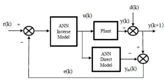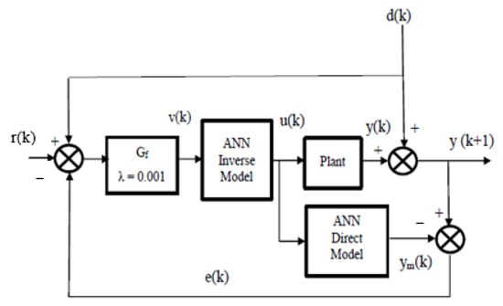 For an ANN-based IMC control method, ANN is trained to learn the inverse dynamics of the process and employed as a nonlinear controller. The IMC can perform efficiently if the actual plant and plant model matched exactly. The combination of ANN and IMC is proven to provide good performance of the control system. For example, the Neural Network Internal Model Control (NNIMC) is developed to control the top and bottom composition in the distillation column for set point and disturbance rejection performance analysis []. The result shows NNIMC provides better performance which is more robust and stable when compared to the conventional proportional-integral plus feed-forward controller. Sun et al. [] proposed the neural network inverse scheme and 2-degree-of-freedom internal model control and improve the tracking and disturbance rejection performances. In the application of inverted pendulum system [], IMC was designed using the inverse of the plant model and showed better response specifications when compared with the conventional Proportional-Integral-Derivative controller. The simulation results also demonstrate the robustness of the IMC. The ANN-based IMC is also depicted in the application of wastewater treatment plant []. In this new ANN-based IMC, the control performance was improved in which reduced the performance degradation.