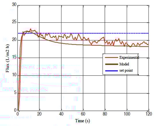 The selection of the IMC filter was based on preliminary dynamic information about open-loop process time constant. Figure 12 shows the open loop response of both the simulation model as well as the real system. In addition to seeing that the desired value for the flux was not achieved as it went descending, the open-loop time constant was approximately 1 s. Therefore, at first, values for the IMC time constant were set a little bit less than half of the open-loop time constant (0.25–0.5 s), but the flux response was too fast. A smaller filter time constant allowed for a smoother response and a more stable system. This is what motivated the search of the IMC filter time constant as lower than one order of magnitude than this initial value 0.0001 to 0.01. The final proposal was 0.001. This may seem a rather small value, however, as that one was showing better performance therefore was taken as the final value for the IMC filter, even the variability in the manipulated variable would not be large (limited).