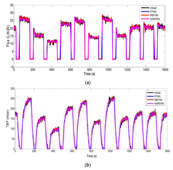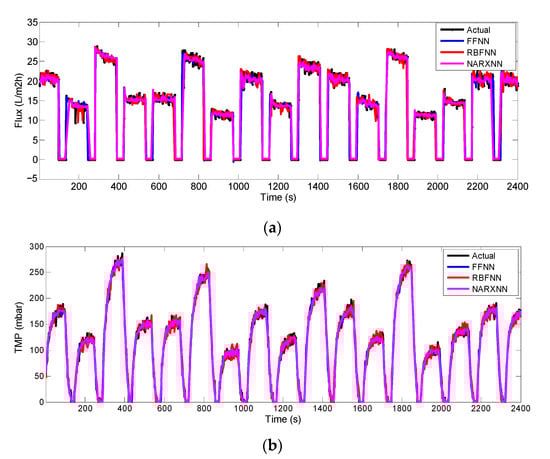 For the testing results shown in Table 3, the trend of performance is almost the same as given by the training results. For both flux and TMP, the RBFNN shows superior performance compared to the FFNN and NARXNN methods with respect to R2, MSE, and MAD criteria.