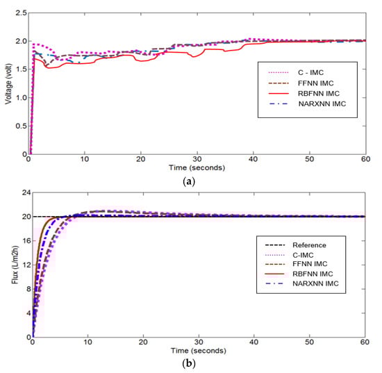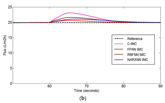 The output flux with 30% magnitude of step disturbances which resulted in 6 L/m2h was introduced at the interval time of 60 to 80 s and the performance of the system was observed as shown in Figure 16. As can be observed from Figure 16, the RBFNN IMC exhibited the best capability in rejecting the disturbance with a small overshoot (peak value) as compared with the other controllers. This was also the situation with the other tested disturbances.