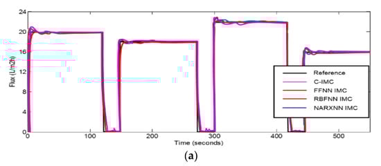 The step response evaluation was performed into the modified IMC neural network controllers and compared with the conventional IMC (C-IMC) both for setpoint and disturbance rejection performances. The setpoints for input–output response performance are presented in Figure 15a–c for all controllers. The operational setpoint for the permeate flux was given at 20 L/m2h. The numerical results are tabulated in Table 4. It may be observed from Table 4 that the modified IMC neural network control showed good transient response and error performances for all criteria. The FFNN IMC and C-IMC depicted almost similar performance which settled at 25.77 s and 27.51 s, respectively. For overshoot criteria, the RBFNN IMC showed good results with only 2.44% and for NARXNN IMC it was 3.98%. The overshoot of the FFNN IMC was 6.73%, while high overshoot was produced by C-IMC with 10.45%. The TMP effect of the controller response indicated a minimal difference between each other. It could only be notified at the beginning of the controller response. From the overall result of the step response performances given in Table 4, the RBFNN IMC controller outperformed the C-IMC as well as the FFNN IMC and NARXNN IMC controllers.