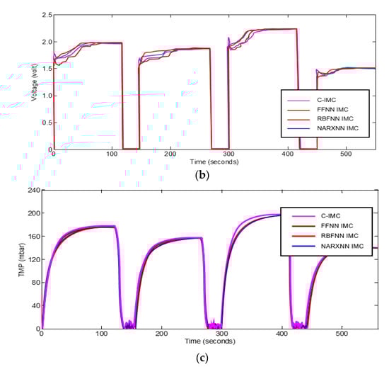 The behavior of voltage from the controllers towards the set-point tracking performance is illustrated in Figure 17b. It can be seen that all controllers exhibited similar responses, which fluctuated at the beginning of the simulation time and became more stable when the flux maintained at the set point. The C-IMC showed an excessive response of voltage at every setpoint changes test as shown in Figure 17b. The TMP profile is given in Figure 17c. Almost similar performance of the controllers is depicted. There was a slightly small deviation identified from the C-IMC controller when the TMP response was reached around 200 mbar. It is because of the high overshoot of the controller at the beginning of the cycle. Overall, the TMP profiles for each of the controllers reached the same TMP level in due course.