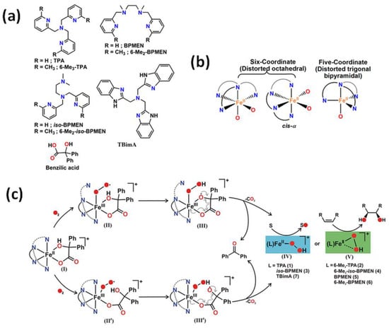 (a) Various types of tetradentate ligand; (b) coordination geometry at the metal center of iron(II) benzilate complexes; (c) The mechanism of oxidative decarboxylation of iron(II) benzilate complexes of tridentate ligands as follows: formation of iron(III) superoxide radical intermediate (II) and analogous iron(III) superoxide radical intermediate (II′), followed by generation of iron(III) hydroperoxo oxyl radical intermediates (III and III′) due to hydrogen atom abstraction from the hydroxy group of α-hydroxy acid. Decarboxylation of III and III′ generates iron(II) hydroperoxo intermediates (IV and V) that could oxidize sulfide to sulfoxide and sulfone, and provide cis-diol product in reactions with olefins (only V) [31]. TPA is equivalent to the TPMA abbreviation. Reprinted with permission from American Chemical Society, Copyright 2016.