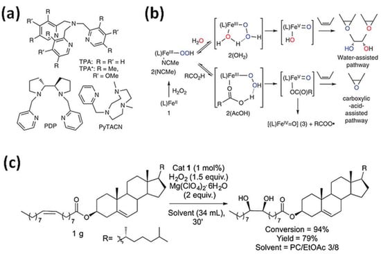 (a) Tetradentate ligands in bio-inspired non-heme iron-mediated olefin oxidations; (b) Activation of H2O2 by non-heme iron oxidation catalysts with the assistance of water or carboxylic acids with TPMA- (1–3) and TPMA*-based (1 *–3 *) complexes [6]. Reprinted with permission from Nature Publishing Group, a division of Macmillan Publishers Limited, Copyright 2014. (c) Gram-scale syn-dihydroxylation of cholesteryl oleate catalyzed by tips3TPMA (1) with H2O2 as oxidant [4]. Reprinted with permission from American Chemical Society, Copyright 2018.