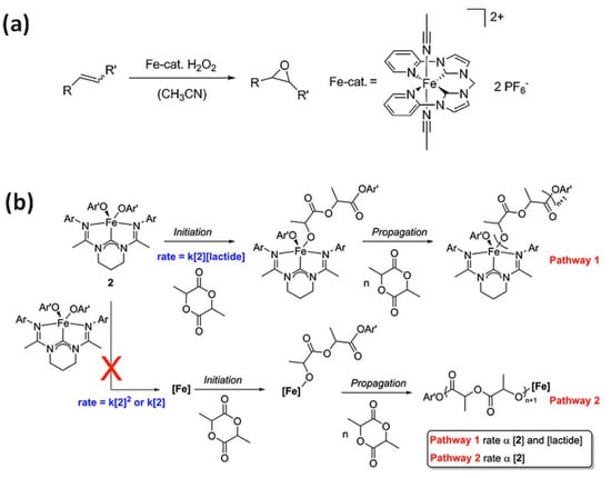 (a) Catalytic epoxidation of olefins using N-heterocyclic carbene complex (NCCN) and H2O2 as the oxidant [8]. Reprinted with permission from WILEY-VCH Verlag GmbH & Co. KGaA, Copyright 2014. (b) N-heterocyclic carbene complex-(carbenodiamidine)Fe(4-methoxyphenoxide)2 (2) in polymerization of lactide [55]. Reprinted with permission from Elsevier Ltd., Copyright 2014.
