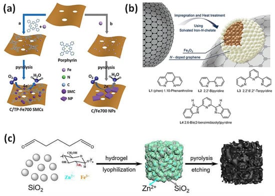 Heterogeneous catalysts: (a) Synthetic routes for the preparation of iron (Fe) single clusters immobilized on N-doped porous carbon (C/TP-Fe700 SMCs) and iron-based nanoparticles (C/Fe700 NPs) [83]. Reprinted with permission from WILEY-VCH Verlag GmbH & Co. KGaA, Copyright 2018. (b) Preparation of Fe2O3-based nanocatalysts by pyrolysis on carbon support [91]. Reprinted with permission from WILEY-VCH Verlag GmbH & Co. KGaA, Copyright 2015. (c) Multiscale porous Fe-N-C catalyst produced with SiO2 and Zn as co-templates [94]. Reprinted with permission from Royal Society of Chemistry, Copyright 2019.