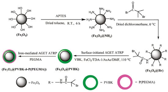 Recently, a major area of research and technological development in the field of polymer synthesis is focused on hybrid materials composed of functional polymers as an organic segment and inorganic nanostructured compounds [142,143]. In this context, the introduction of metal oxide nanoparticles in the polymeric nanocomposites provides advanced technological materials has attracted special attention due to their multifunctional properties as electronic, optical, and unique mechanical characteristics [144]. Magnetic iron oxide nanoparticles (MIONPs) as a high-performance material are extensively used in medicine as drug delivery systems, in hyperthermia techniques, tissue repair, and for visualization by magnetic resonance imaging (MRI) [145]. Iron(III)-mediated AGET ATRP with AsAc as a reducing agent was utilized to modify functionalized MIONPs with fluorescent monomer 9-(4-vinylbenzyl)-9H-carbazole (VBK), subsequently covered with hydrophilic monomer poly(ethylene glycol) methyl ether methacrylate (PEGMA) to improve water solubility (Figure 5) [133].