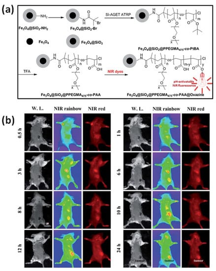 (a) Synthetic route for the preparation of MNPs characterized by bifunctional properties i.e., NIR fluorescence and magnetism by iron-mediated SI-AGET ATRP, subsequently modified by pH-activatable benzo[a]phenoxazine derivatives; (b) In vivo NIR fluorescence images of prepared hybrid material in 4T1 tumor-bearing mouse at indicated times after intravenous administration [135]. Reprinted with permission from Royal Society of Chemistry, Copyright 2015.