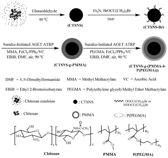 Nanoparticles-based hybrid materials were also received by modification of silica nanoparticles (SiO2) with methyl methacrylate (MMA) and PEGMA300 by surface-initiated AGET ATRP using iron(III) chloride/triphenylphosphine (FeCl3/PPh3) as a catalyst complex and AsAc as a reducing agent, receiving precisely defined product proved by narrow MWD of grafted polymer chains [139]. Another silica-based substrate modified by FeCl3/IDA (iminodiacetic acid)/AsA-mediated ATRP was silica gel. Prepared high oil-absorption resins of copolymer composed of MMA and n-butyl methacrylate (nBMA) grafted from silica material demonstrated good heat-resistant quality, good oil absorbency, oil retention, and regeneration properties—promising features for an efficient oil-absorption material [134]. The synthetic nanomaterials, such as carbon nanotubes (CNTs) [136] and synthetic rubber polystyrene-b-poly(ethylene-co-1-butene)-b-polystyrene (SEBS) [140] were enhanced by modification via AGET ATRP with AsAc as a regenerator of catalyst complex FeIIICl3·6H2O/tris(3,6-dioxaheptyl)amine (TDA-1), FeIIICl3·6H2O/TDA-1 or PPh3, respectively. Over many advantages such as special mechanical, physical and chemical properties, CNTs have some disadvantages, i.e., limited dissolution in solvents and dispersion in most polymers, which reduces their practical application. For this reason, a wide range of polymers, such as PSt, PMMA and PPEGMA were successfully grafted onto the CNTs surfaces using iron-catalyzed system, therefore improving their properties [136]. While, SEBS as a commercially important thermoplastic elastomer, widely used in plastics, coatings, and adhesives, was modified by incorporation of PSt, PMMA, and PtBA to improve its compatibility with other materials [140]. Iron(III)-mediated AGET ATRP catalyst systems, as a biocompatible and low toxic approach, were successfully applied for modification of naturally-derived surfaces of chitosan nanospheres (CTSNSs), providing additional environmentally-friendly aspects over the ecological substrate, for preparation of hybrid materials (Figure 7). Well-defined PMMA or amphiphilic PMMA-b-PPEGMA brushes were grafted from the CTSNSs to yield individual nanospheres composed of a chitosan core and a well-defined polymer layer [141].