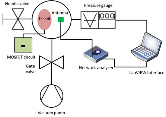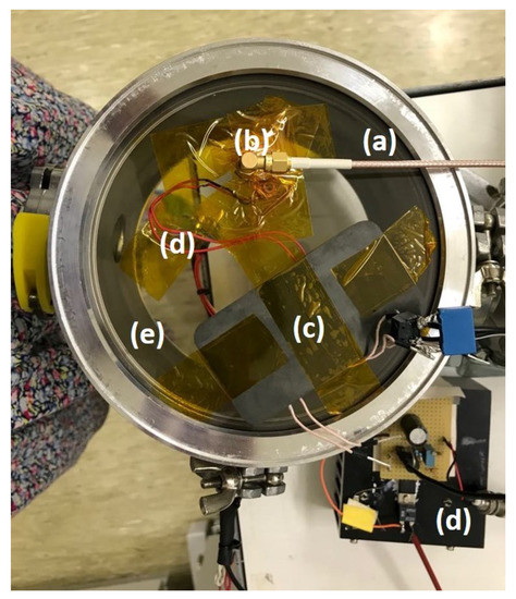 For this reason, a customised polymethyl methacrylate (PMMA) window was manufactured to test the prototype in vacuum. The PMMA circular window had an outer diameter of 160 mm corresponding to the previous viewport diameter and the chamber diameter. The central part of the window, i.e., its 5 cm diameter central circle, had a 2 mm thickness. The transmitting (Tx) coil and Tx antenna were placed outside facing the prototype and the receiving (Rx) coil. Reducing the thickness to 2 mm was done to increase the quality of the signal delivered by the antenna. Since the structure of the chamber did not allow one to put the transmitting coil and the interrogation antenna on different sides, the heating power transfer was separated from the antenna interrogation. The receiver coil was connected to a 10 surface mounted device (SMD) resistor which was soldered on top of the chip.