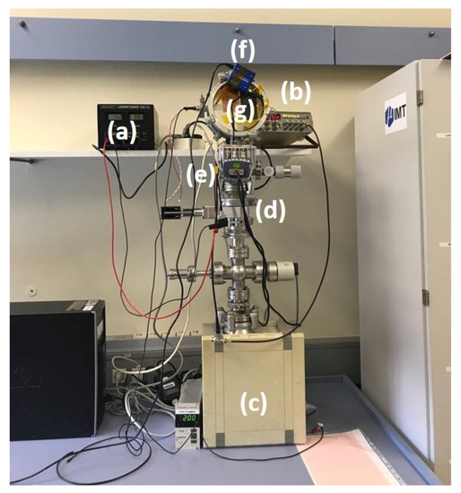 A BCG 450 triple gauge from INFICON (Bad Ragaz, Switzerland) was used as a pressure sensor to monitor the pressure: it contained a Bayard Alpert gauge, a Pirani gauge and a capacitive diaphragm gauge with automatic switch to measure pressures between 5 × 10−8 Pa and 1.5 × 105 Pa. The pressure sensor contained a display indicating the real time pressure and was connected to a LabVIEW user interface via an RS232 to USB cable.