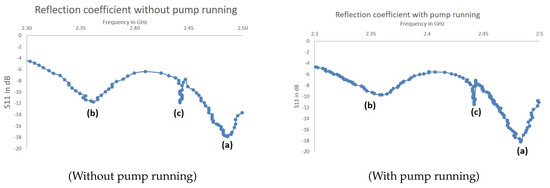 Figure 4, it can be seen that the operation of the pump influences the signal of the antenna. A secondary self resonance of the antenna can be seen left from the SAW peak. The SAW peak is located between 2 antenna self resonances. A rule of thumb criterion to identify a resonance is an