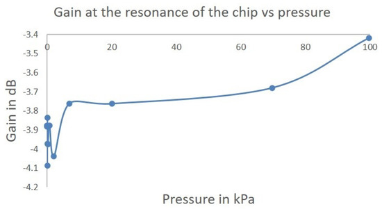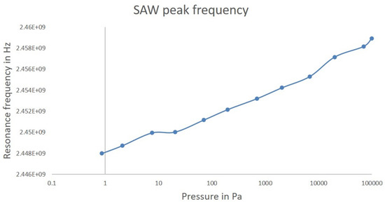 The values of the gain at the SAW peak frequency are shown in the graph between −4.03776 dB at 2058.71 Pa and −3.417872525 dB at 99,722.23157 Pa. No real trend could be observed despite a continuous increase of pressure. The standard deviation of the gain is stable for each value of the pressure around 0.15%.
