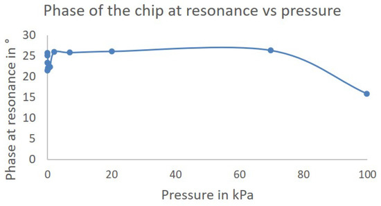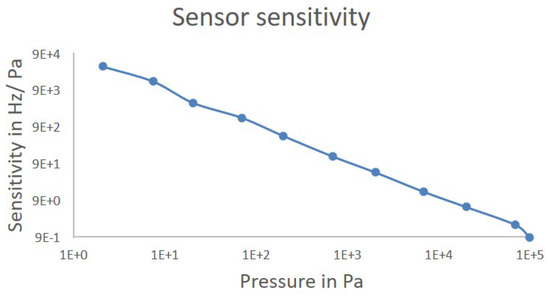 Table 1. The average sensitivity is 5880 Hz/Pa, i.e., 2.4 ppm/Pa between 0.9 Pa and atmospheric pressure. Inside the vacuum, the resonance frequency of the SAW chip measured changed with respect to pressure. The resonance frequency increased with the pressure between 244,7989,448 Hz at 0.871853 Pa and 2,448,780,148 Hz at 99,722.23 Pa. The sensitivity constantly decreased with the pressure according to the expectations between approximately 42 kHz/Pa at 0.9 Pa and 1 Hz/Pa at atmospheric pressure. The sensitivity is higher in the rough vacuum area between the minimum pressure and 200 Pa approximately corresponding to the limit between the Knudsen regime and the transition regime [