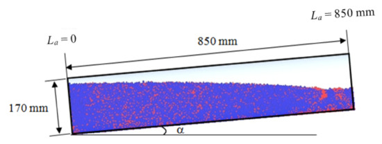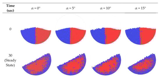 A drum with a diameter of 170 mm and length of 850 mm (Figure 1) was used in the simulation to investigate the effect of the angle of inclination on the particle mixing dynamics in rotating drums. Four simulations with angles of inclination α = 0° (horizontal), 5°, 10°, and 15° were carried out. In each simulation, 200,000 particles of 3 mm diameter (small) and 25,000 particles of 6 mm (large) were generated and placed in the drum as shown in Figure 2. A volumetric fill of around 50% has been achieved with each size of particles compromising 25% of the drum volume. The system was then simulated with an angular speed of 30 rpm. The simulations were carried out until a steady state was achieved, and then the properties considered were calculated. In this work, when the average properties considered are almost constant, it was considered that the particle flow was at a steady state condition. The time found for the onset of the steady state was t = 30 s. The material properties for the particles and drum are the same as those suggested by Elskamp et al. [34] and are given in Table 1.