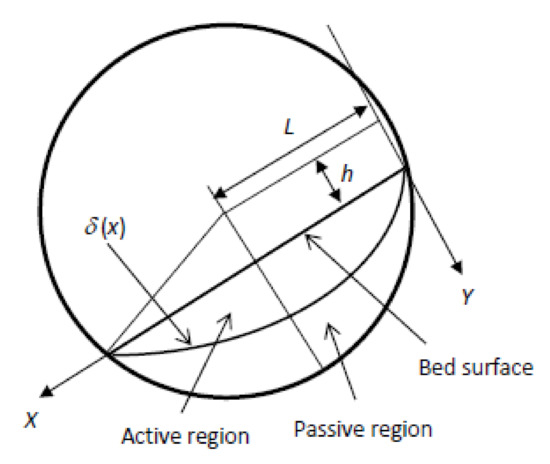 where h is the normal distance between the centers of the bed surface and the drum, ω is the rotational speed of the drum, and ux (= f(x)) is a function of bed surface velocity along the length of the particle bed. As an illustration, Figure 3 shows a schematic diagram of active and passive regions of a rotating drum and some parameters in Equations (14)–(17).