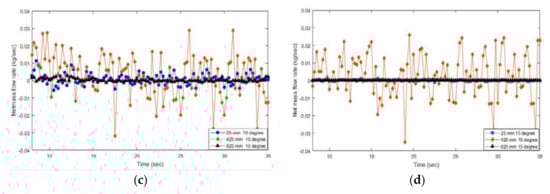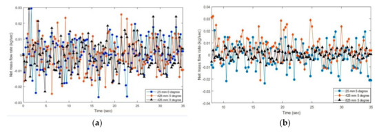 Fluctuation of net mass flow rate at three locations for different angles of inclination: (a) 0°; (b) 5°; (c) 10°; and (d) 15°.