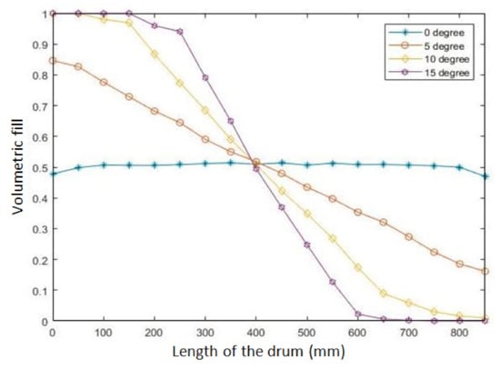 Variation of volumetric fill along the length of the drum for the inclinations of 0°, 5°, 10°, and 15°.